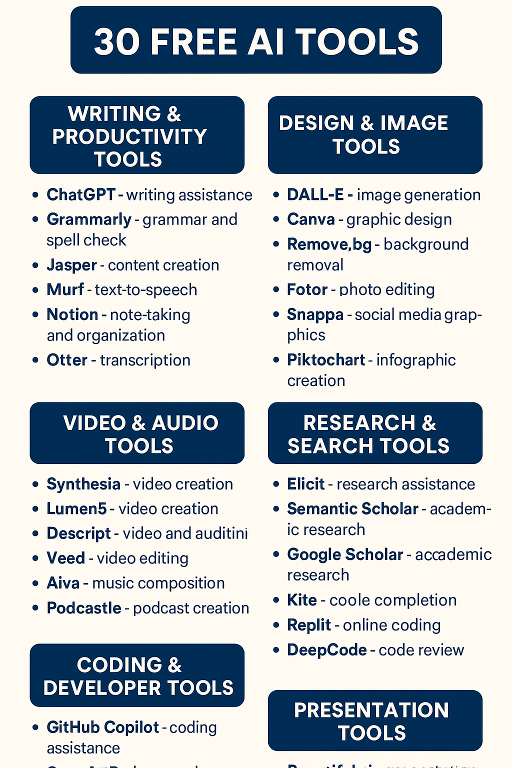 AI is not just for tech experts—it’s for everyone. These 30 free AI tools in 2025 can help you write better, design faster, code smarter, and work more efficiently. Whether you’re a student, small business owner, or freelancer, there’s a free AI solution that can save you time and boost your productivity.